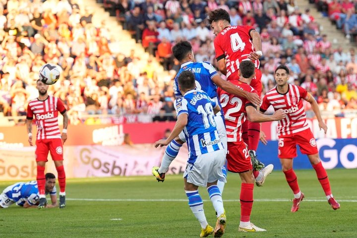 Sheriff vs Real Sociedad. Aritz Elustondo Real Sociedad header from the right side of the six yard box to the top right corner.